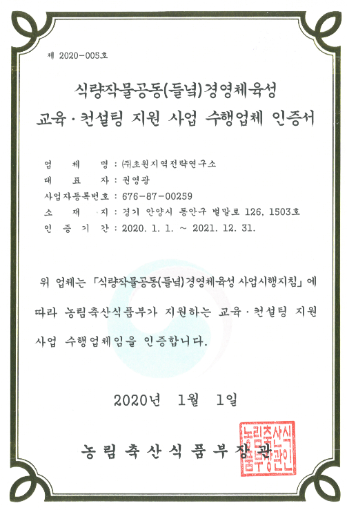 당사는 식량작물공동(들녘)경영체육성 사업시행지침에 따라 농림축산식품부가 지원하는 교육·컨설팅 사업 수행업체 업체임을 인증합니다.