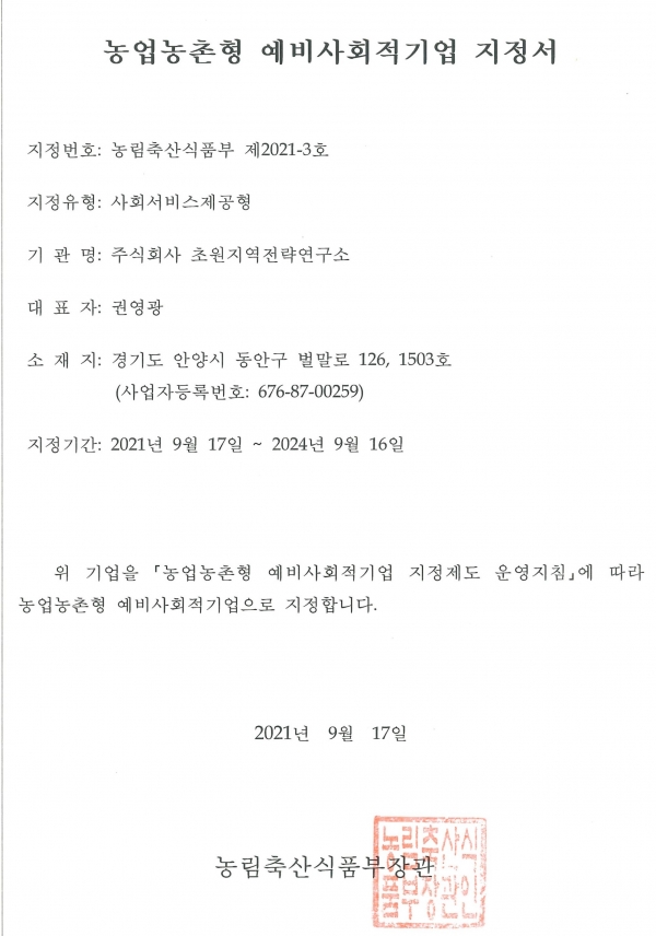 당사는 농업농촌형 예비사회적기업을 지정 받은 업체임을 인증합니다.
